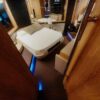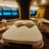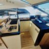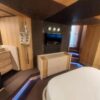 Tre cabine, più cabina equipaggio doppia, Salone superiore abitabile interno/esterno con piano rigido retrattile elettricamente, Con la sua cabina armatoriale a tutto baglio, lussuosa suite VIP in avanti, ulteriore cabina doppia per gli ospiti e cabina equipaggio separata, il punto focale è il suo enorme salone interno-esterno completamente climatizzato con tetto apribile a scomparsa. Alla sua estremità di poppa, vanta un ampio e molto pratico pozzetto, completo, garage gara, passarelle retrattile e una piattaforma da bagno.