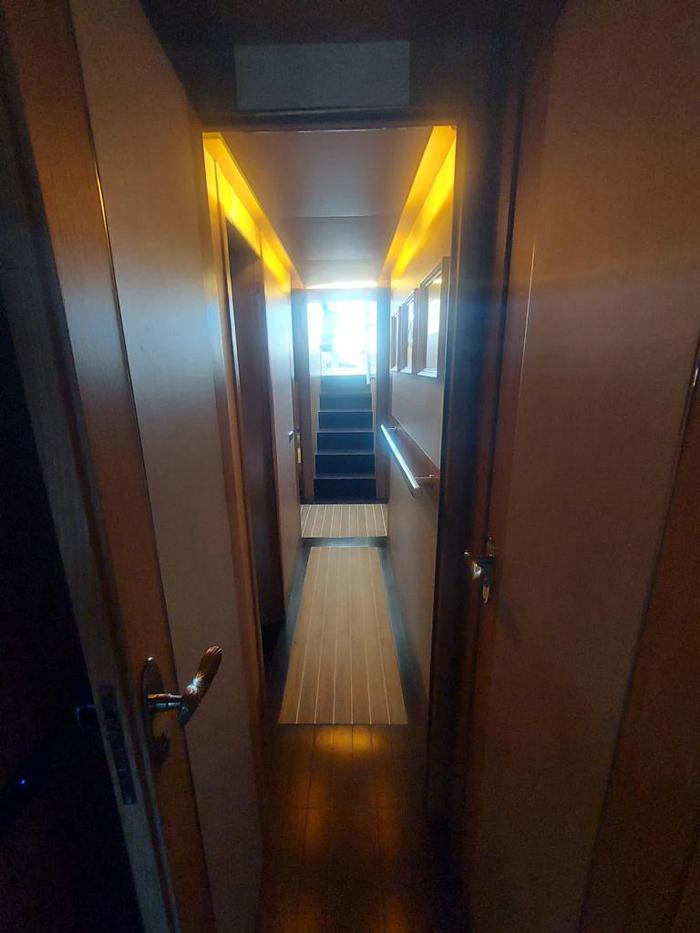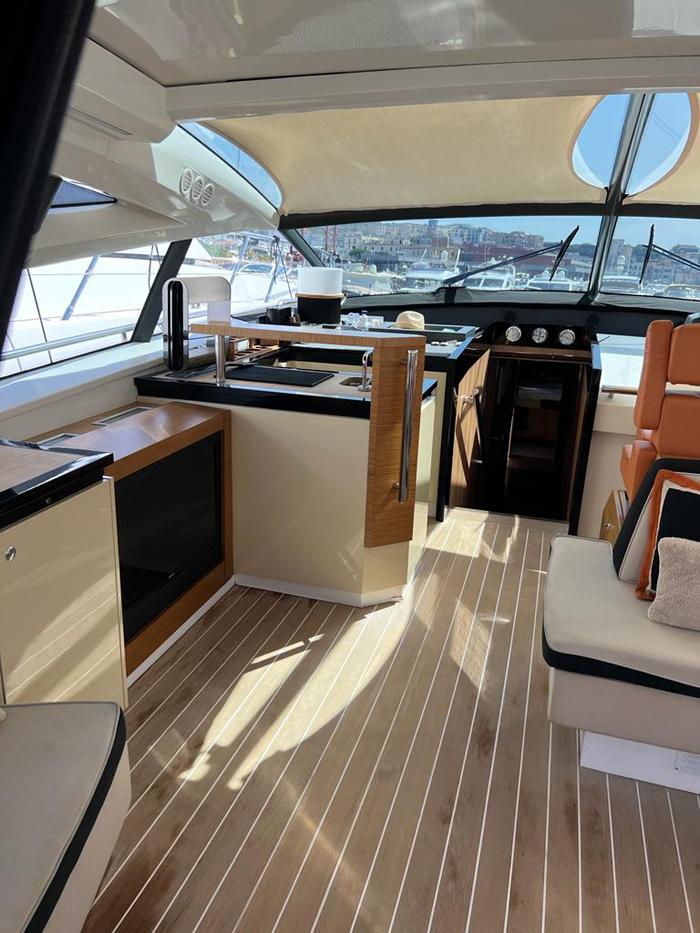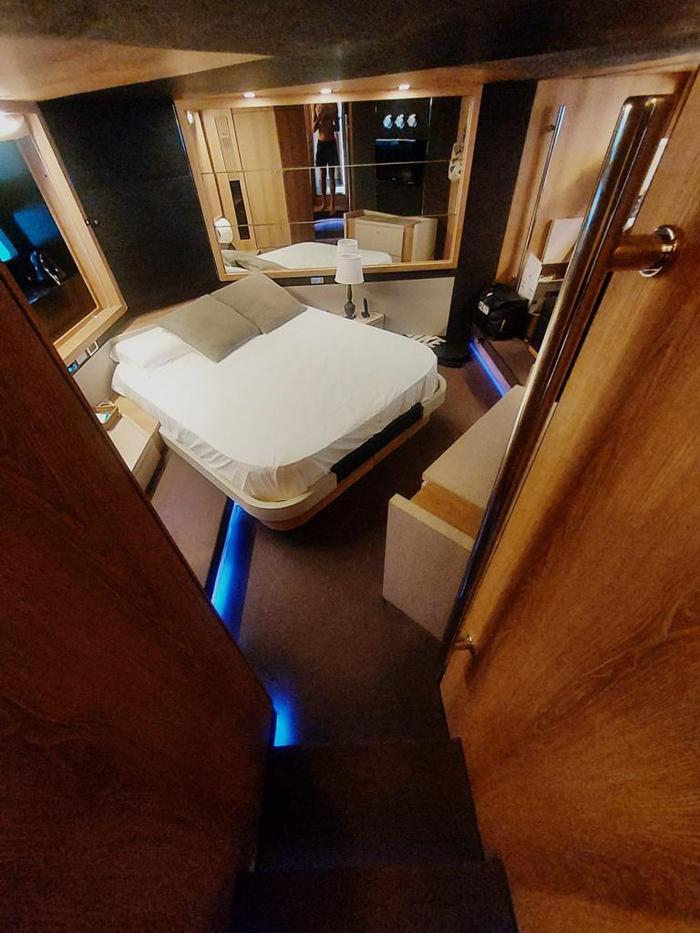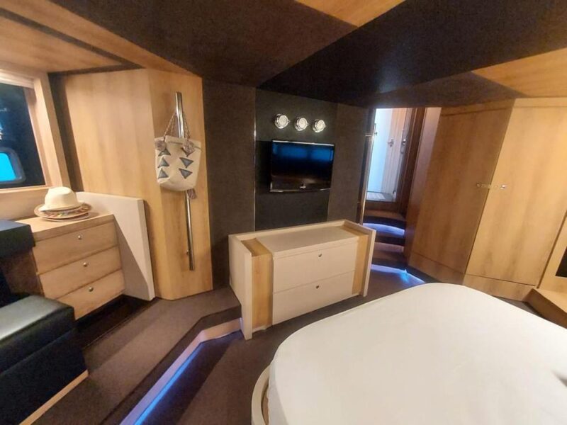 Tre cabine, più cabina equipaggio doppia, Salone superiore abitabile interno/esterno con piano rigido retrattile elettricamente, Con la sua cabina armatoriale a tutto baglio, lussuosa suite VIP in avanti, ulteriore cabina doppia per gli ospiti e cabina equipaggio separata, il punto focale è il suo enorme salone interno-esterno completamente climatizzato con tetto apribile a scomparsa. Alla sua estremità di poppa, vanta un ampio e molto pratico pozzetto, completo, garage gara, passarelle retrattile e una piattaforma da bagno.