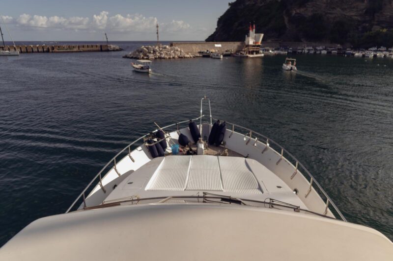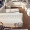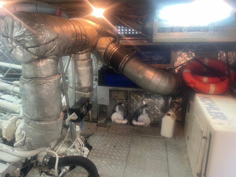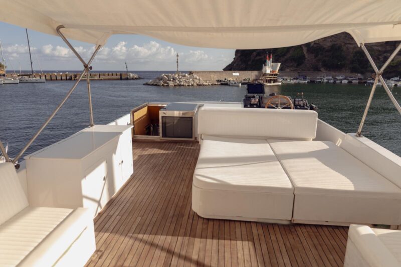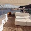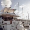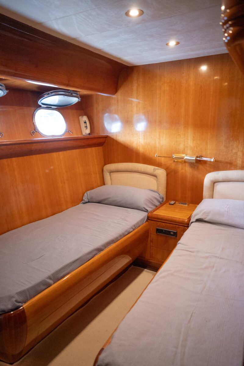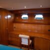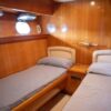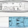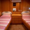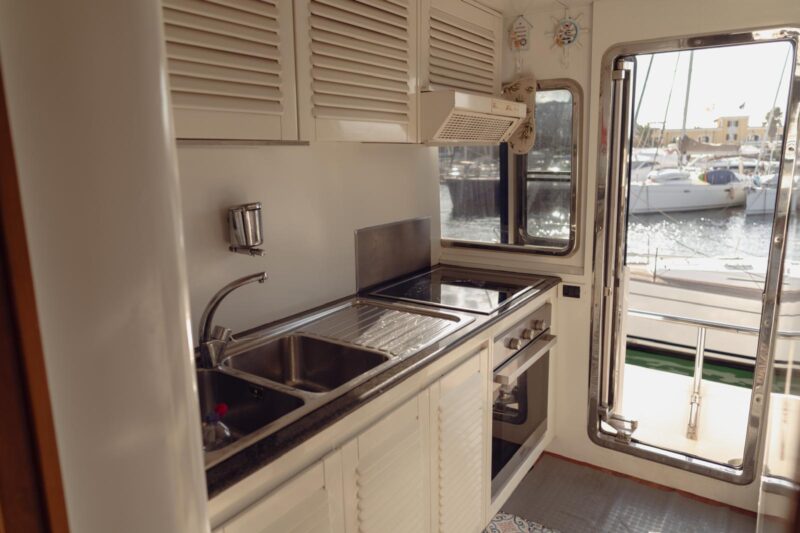 Due cabine ospiti doppie con bagno in comune. Cabina marinaio con bagno. Cucina completa di elettrodomestici, 2 frigoriferi, freezer, forno e microonde.